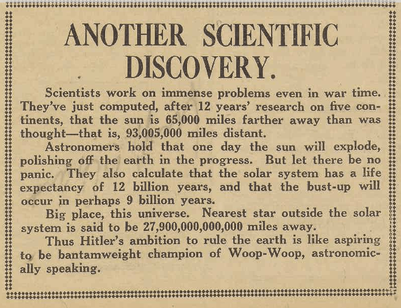 On 27 November, 1942, a random report about a scientific discovery related to the size of the solar system (and the universe) was concluded with a pretty obscure reference to Adolf Hitler as the bantamweight champion of Woop-Woop. 1