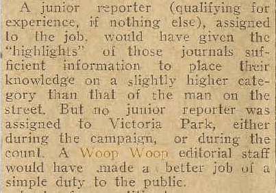In February 1945, in a report decrying poor quality journalism in relation to reports on the distribution of preferences in Victoria Park. Claiming that any junior reporter would have done a better job than the senior reporters tasked with informing the public.