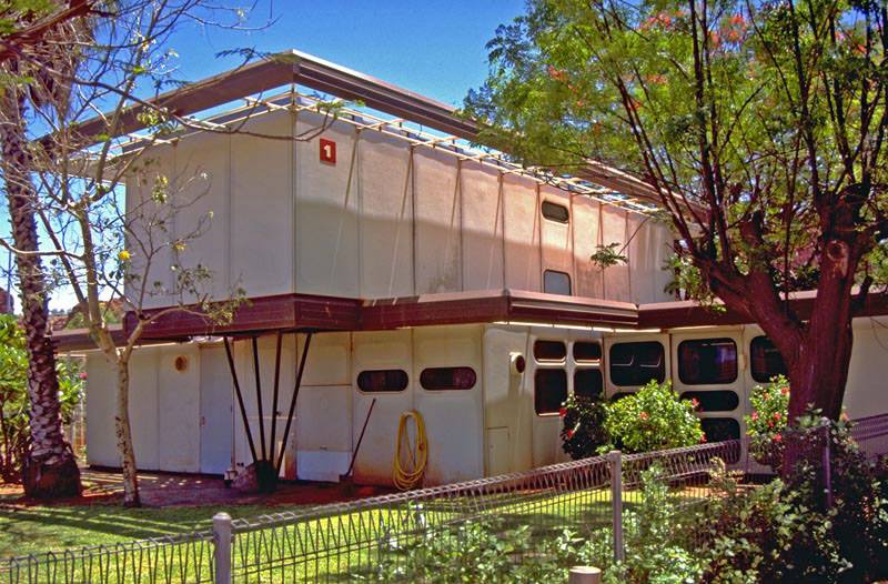 Mercifully I still have photos I took in 1988. Look at the houses. They all look as though they were designed by an architect straight out of The Jetsons. Pure 1950s sci-fi with lots of ovoid windows and what looks like plastic. It was a town created by Mount Goldsworthy Mining Associates for workers in their iron ore mines. It was designed in 1970 by an architect named Lawrence Howroyd.