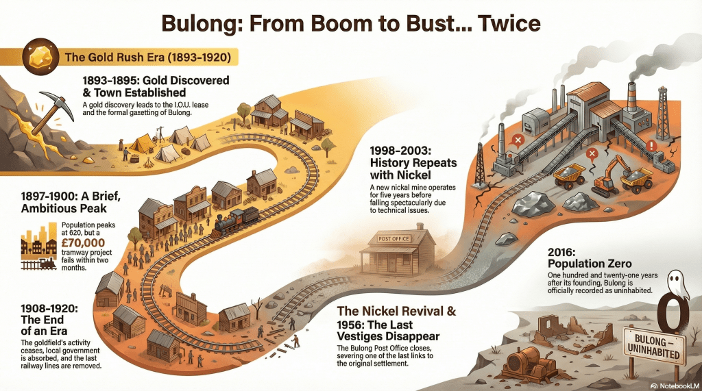 Bulong remains an abandoned town. Its history, spanning two centuries of mining ambition, confirms that while gold and nickel promise wealth, logistics, environment, and engineering ultimately dictate success, or in Bulong’s case, spectacular failure.