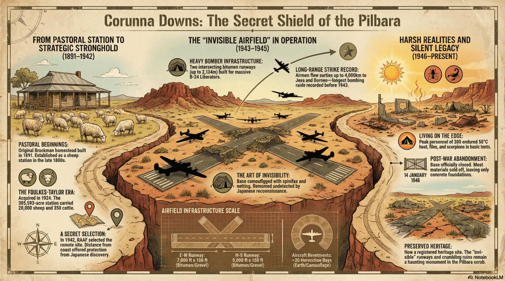 The entry of Japan into World War II in 1941 created a political and military emergency for Australia. The northern coastline was vulnerable, and the Royal Australian Air Force (RAAF) required remote, secure locations to launch long-range strikes. In 1942, the military looked to the Pilbara. The isolation of Corunna Downs, which had long been a pastoral challenge, suddenly became its greatest strategic asset.13 14 15