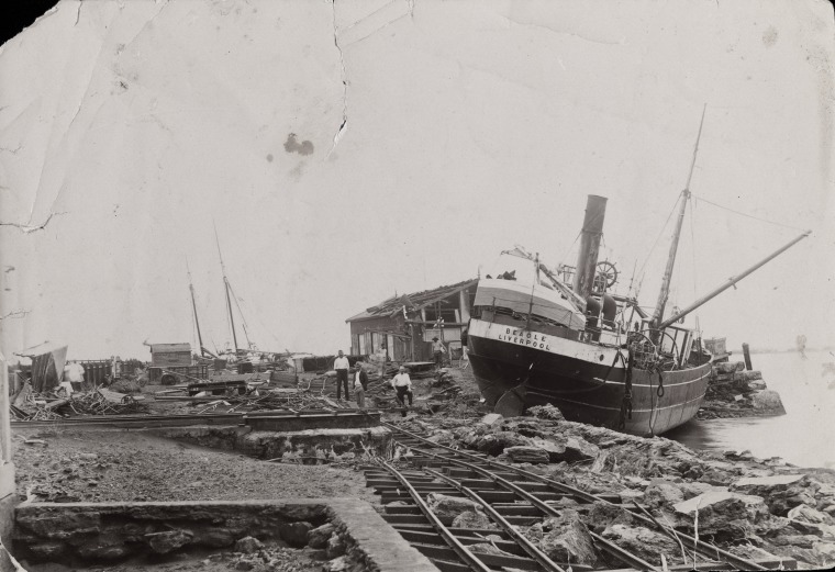 - State Library of Western Australia, n.d. 4014B: Cyclone damage at Cossack Wharf, with the schooner Harriet and streamship Beagle washed ashore, 1898. Photograph : black and white. Retrieved 11 Dec 1025 from https://encore.slwa.wa.gov.au/iii/encore/# Note: title taken from caption on the back of the photograph. ↩︎