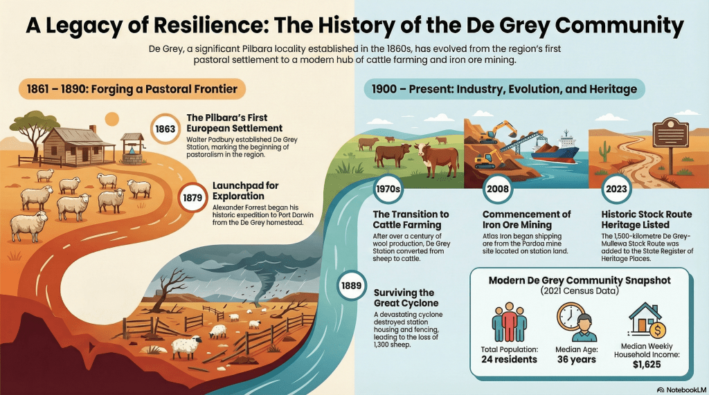 Located in the rugged Pilbara region of Western Australia, De Grey represents a pivotal chapter in the state’s colonial and pastoral history. This account details the establishment of the De Grey River locality, named by explorer Francis Gregory in 1861, and the subsequent founding of De Grey Station in 1863 by Walter Padbury. As the first European pastoral settlement in the North-West, De Grey became a cornerstone of the region’s economy, initially dominating the sheep and wool industry before transitioning to cattle in the 1970s.