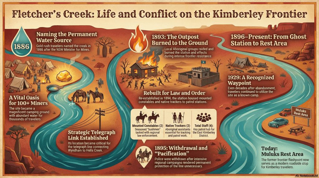Fletcher’s Creek, located on a branch of the Bow River in Western Australia’s rugged East Kimberley district, owes its name to the gold rush era of the mid-1880s, when travellers christened the main tributary of the Ord River after the New South Wales Minister for Mines. Its subsequent importance centered on its strategic location along the telegraph line connecting Wyndham and Halls Creek. A police camp was established there around 1890, primarily tasked with protecting the fragile colonial infrastructure and enforcing law and order in the increasingly contested pastoral region. The history of the Fletcher Creek Police Station, built by police in late 1893/early 1894, is intrinsically linked to the violent frontier conflict, notably suffering an attack and burning by local Aboriginal groups in June 1893. Following intense pacification campaigns in the mid-1890s, the station was withdrawn in December 1895. Today, the site is recognized as a stream location and a modern rest area.