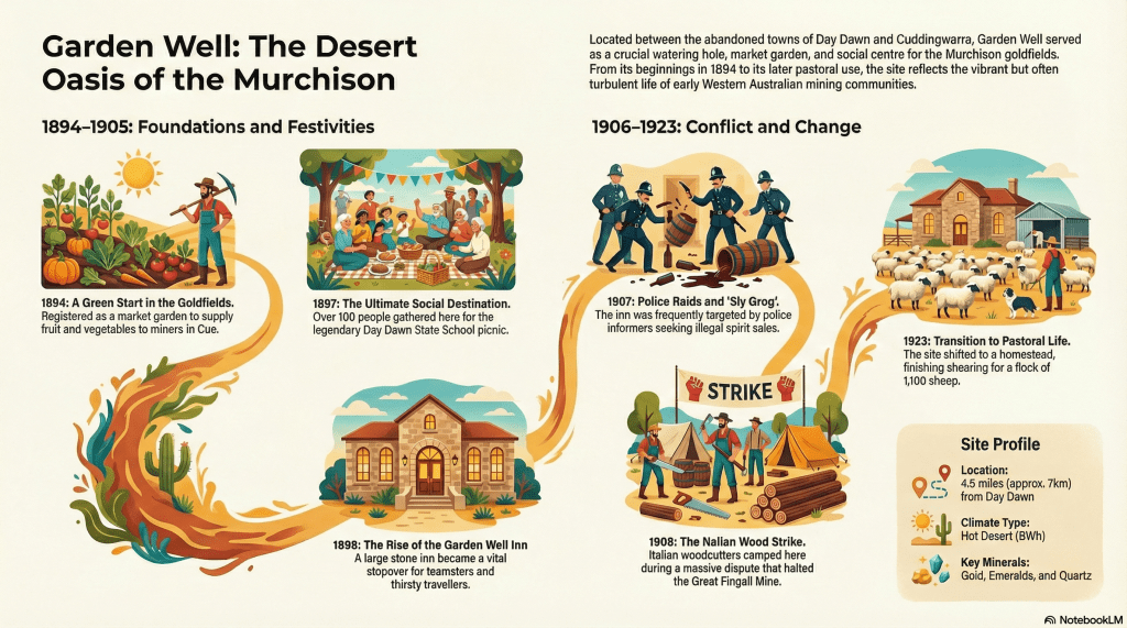In the harsh, arid landscape of Western Australia’s Murchison district, where the “hot desert” climate often dictated the limits of human endurance, the community of Garden Well emerged as a vital, if transient, sanctuary. Located roughly four and a half miles from the bustling gold mining centre of Day Dawn, Garden Well served as a critical support system for the surrounding goldfields. Its history is a complex tapestry of industrial necessity, social conviviality, and the inevitable decline that follows the exhaustion of mineral wealth.1 2 3