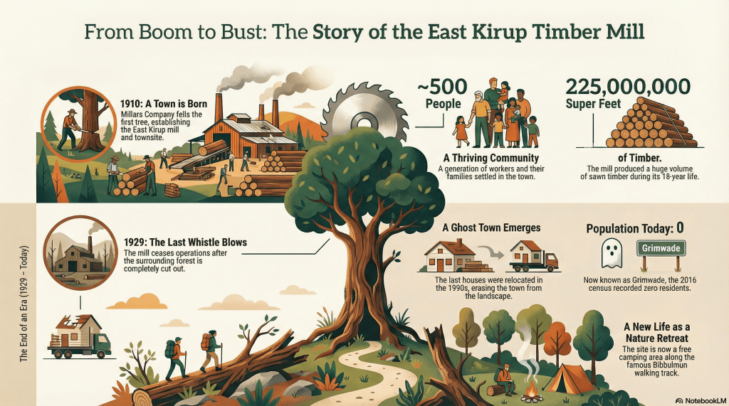 - EAST KIRUP MILL (1929, October 4). The Blackwood Times (Greenbushes, WA : 1905 – 1955), p. 1. Retrieved November 26, 2025, from http://nla.gov.au/nla.news-article266743341 ↩︎