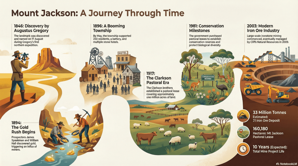 Mount Jackson stands as a prominent 617-metre high landmark in the semi-arid Yilgarn region of Western Australia, approximately 110 kilometres north-north-east of Southern Cross. Its history is a narrative of extremes: from the optimistic “hilarity” of gold rush banquets to the “privations and loneliness” of pioneer life. The community’s trajectory has been shaped by the rigid geology of its Banded Ironstone Formations (BIF), the scarcity of its water, and the shifting economic priorities of the state, moving from gold and wool to iron ore and biodiversity conservation.1 2 3 4 5