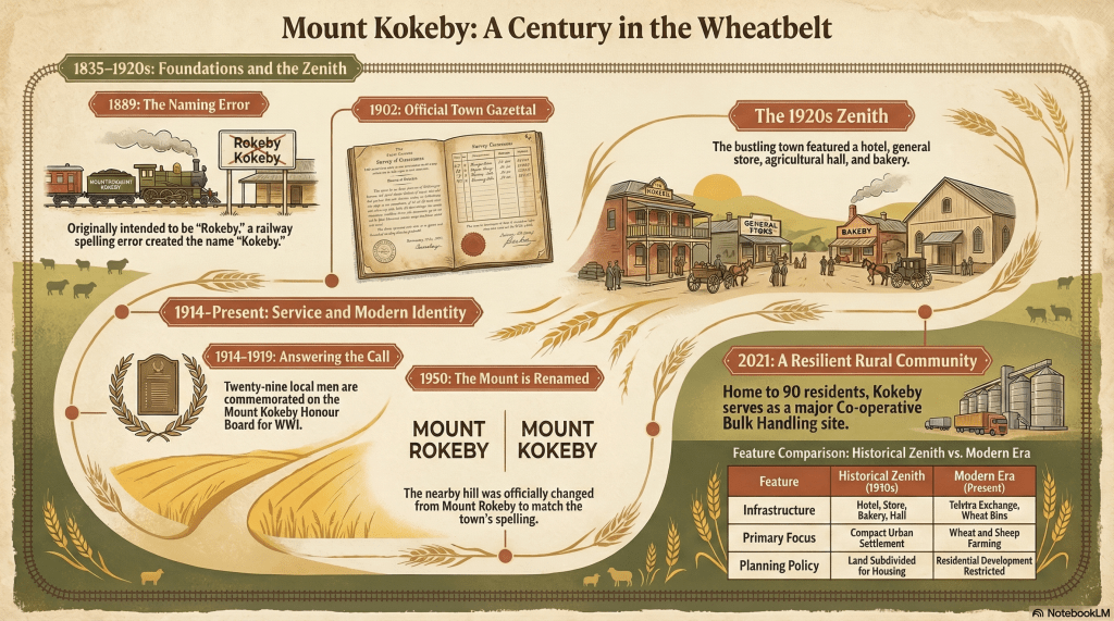 The history of Mount Kokeby serves as a reminder of the shifting nature of rural Australia. From its beginnings as a misspelled railway siding to its golden age as a thriving service town, and finally to its current role as a quiet agricultural precinct, the community has been shaped by the forces of global conflict, technological evolution, and environmental reality. While the physical town has largely vanished, the legacy of its pioneers and the sacrifice of its soldiers remain a vital part of the region’s heritage.