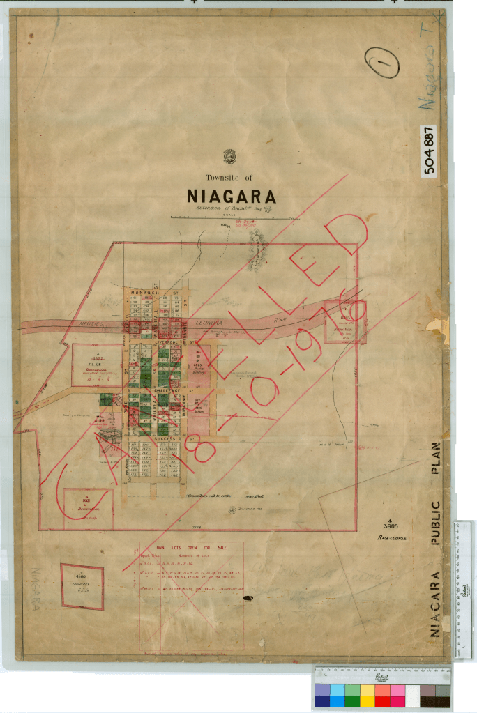 The town’s name was born of frontier irony. It was named after “Niagara Falls,” which was actually a modest three-metre ledge crossing the Niagara Creek. One of the early prospectors bestowed the name most likely in jest, as the small waterfall only ran occasionally during heavy rains. Following the rapid population influx, the Niagara Progress Committee requested a townsite declaration in early 1896. The Land Department officially gazetted the town in November 1896. While seven streets were planned, the town’s modest footprint meant only Challenge and Waterfall streets were ever fully developed.8 9 10