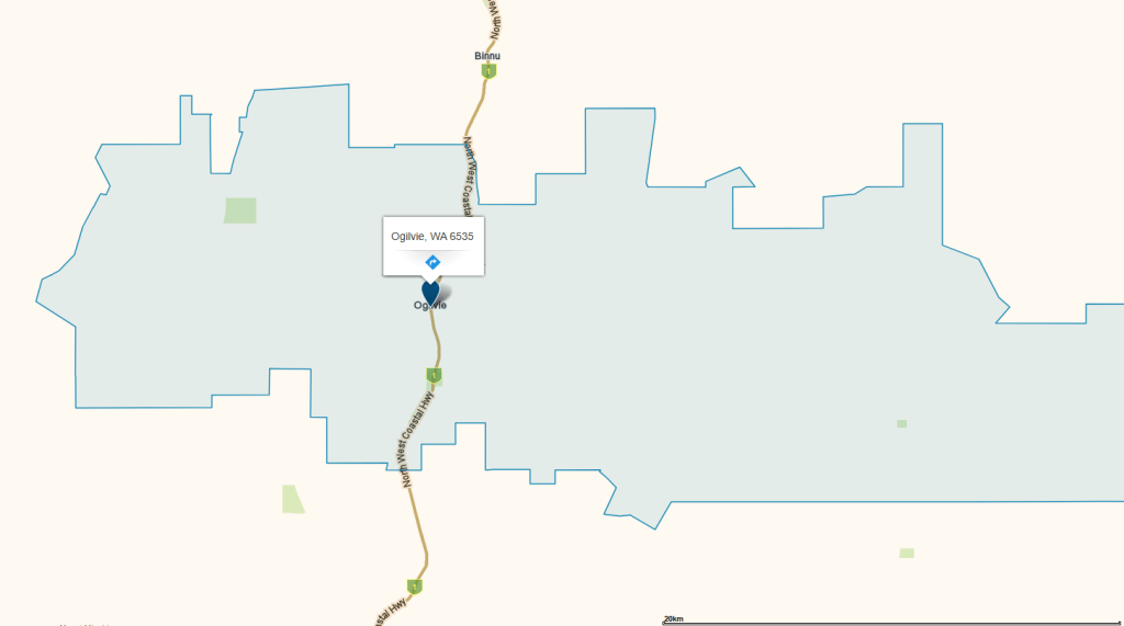 - bonzle.com, n.d. Ogilvie, WA. Retrieved 5 Dec 2025 from http://bonzle.com.au/c/a?a=p&p=286063&cmd=sp&c=1&x=114%2E8523192&y=%2D28%2E3432449&w=85350&mpsec=0&s=noosa&m=13&st=WA ↩︎