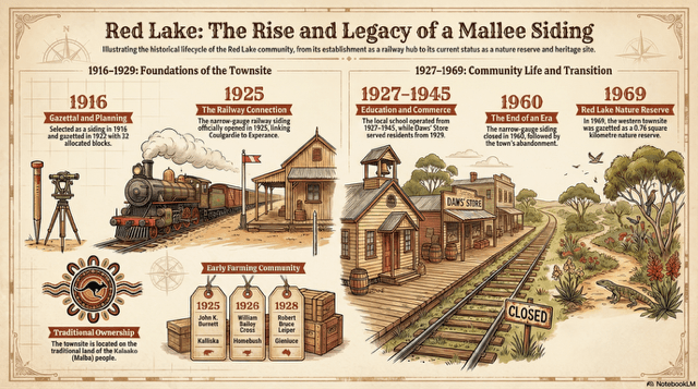 Red Lake serves as a poignant example of the ephemeral nature of early 20th-century settlement in the Western Australian Goldfields-Esperance region. Situated approximately 82 kilometres north of Esperance, the town was established as a vital node on the railway line connecting the coast to the goldfields. This article provides a comprehensive historical account of the community, beginning with its traditional ownership by the Kalaako people and its official recording in 1910. It examines the political and economic drivers behind its gazettal in 1922, specifically the expansion of the Western Australian Government Railways and the burgeoning Mallee agricultural industry. The narrative highlights the social heart of the community, the Red Lake Siding School and the Daw family’s general store, and the economic activity evidenced by numerous registered livestock brands. Finally, the article discusses the environmental and economic factors that led to the town’s decline, culminating in the closure of the railway station in 1960 and the subsequent conversion of much of the townsite into the Red Lake Townsite Nature Reserve in 1969. Today, the area is preserved through heritage trails and markers.