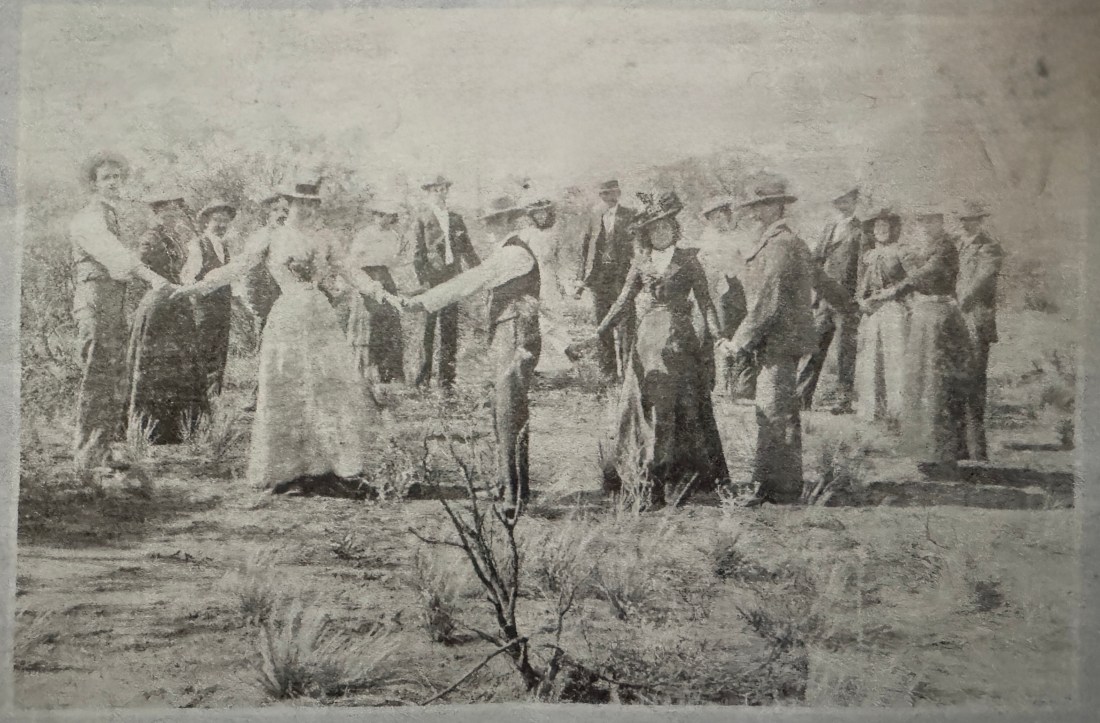 This lighthearted snap shows a picnic gathering at Goongarrie, a flourishing gold-mining site in the back-blocks between Menzies and Kalgoorlie. The first gold discoveries in the area were mde in 1893. The hamlet was also called the Roaring Gimlet, due to the thundering noise of icy desert winds through the gimlet trees. More prosaically, early on it was simply called the 90 Mile camp, its approximate distance from Coolgardie.